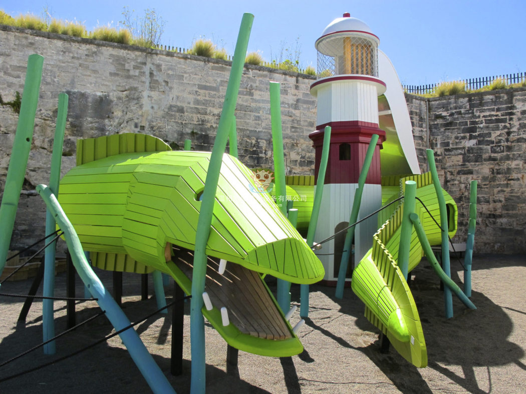 想和鯨魚來個(gè)親密接觸嗎?現(xiàn)在就到它的體內(nèi)來一探究竟吧!還可以從側(cè)面的洞口爬到它的頂部,然后坐滑梯滑下來。