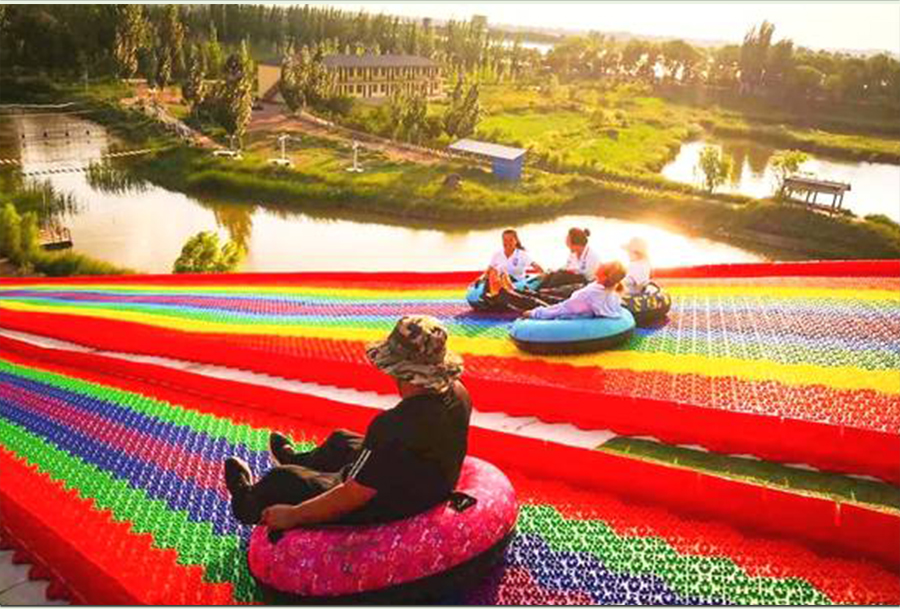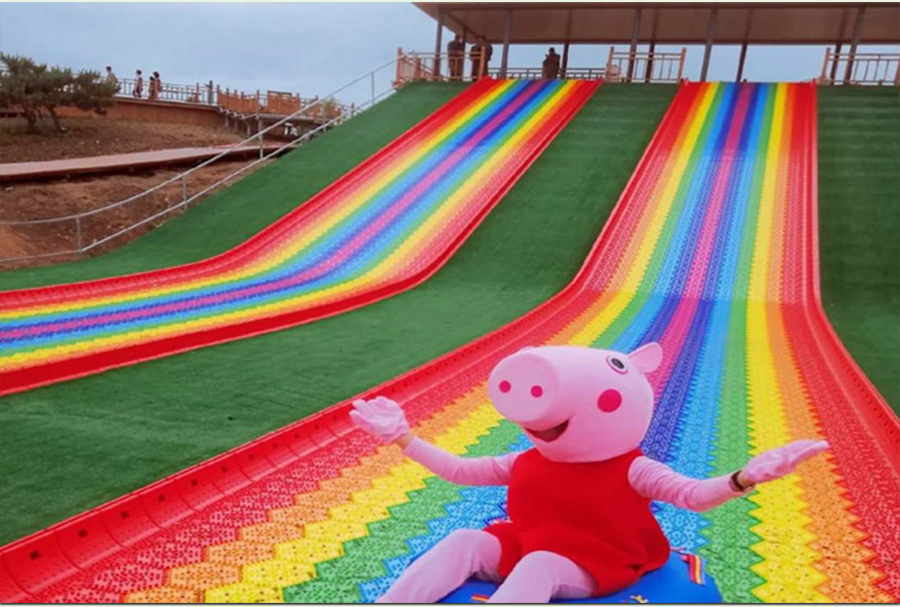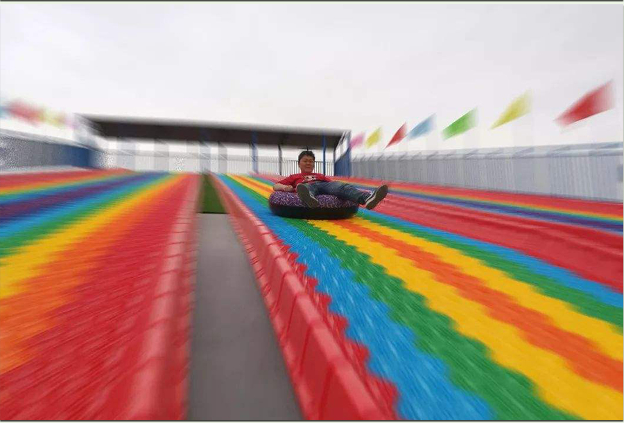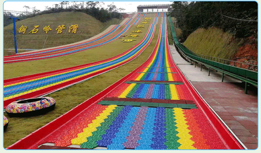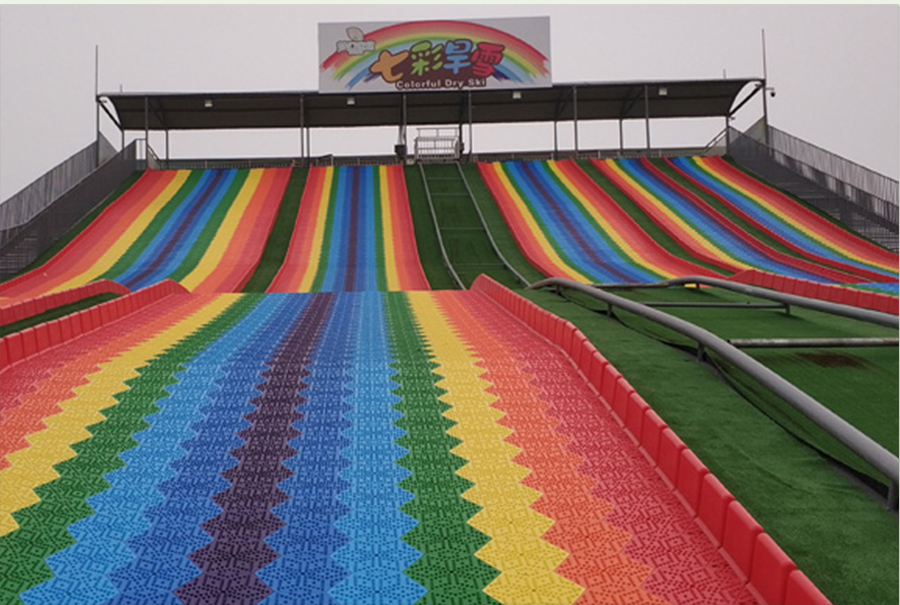 七彩滑梯主要核心部件滑板是采用環(huán)保樹脂PE,經(jīng)一次性注塑工藝成型的模擬滑雪材料。經(jīng)過實(shí)踐與改良,探索出如下圖所示的棒棒糖形狀的旱雪滑板,滑雪板六邊形組合成大型滑道,多色拼搭,遠(yuǎn)看就像山間掛著的彩虹,非常吸引觀眾的眼球,遠(yuǎn)看就有向往的沖動(dòng)。