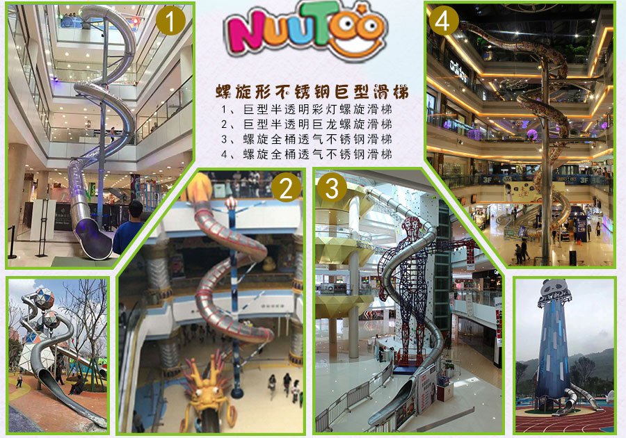 | 適應(yīng)場景 | 游樂場、商場、度假中心、兒童活動中心、酒店、水上樂園 | 主要材料 | 滑梯材質(zhì)為304不銹鋼材質(zhì),厚度3mm,護(hù)管大小為38mm,厚度2.5mm,表面拋光拉絲處理 |
